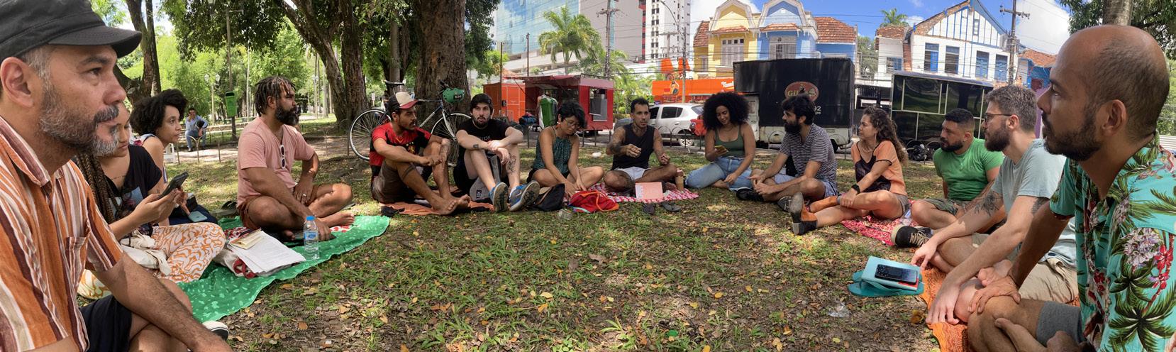 Essa construção do analista grupo indica que a figura do analista está em contínua formação, o que nos obriga a ler as teorias psicanalíticas pelo viés não individualista. Fazemos uma espécie de torção teórica em alguns textos com o objetivo de pensar com o nosso território. Além disso, fazemos leituras de outros saberes, não necessariamente psicanalíticos, estrito senso (se é que é possível essa divisão), para compor o nosso território. É quando a Escuta de Gira encontra a roda de estudos. Além de atendermos as pessoas no sábado na Praça do Derby, nós também promovemos uma roda de estudos em paralelo, com o mesmo princípio político e epistêmico da Escuta de Gira. Isto é, discutimos textos sem que haja alguém na figura de um palestrante, estando sempre atentos ao aparecimento das hierarquias que inevitavelmente podem surgir. Nosso cuidado é para que elas não operem no sentido de fazer de nossas diferenças um marcador epistêmico de distinção. Lemos e conversamos sobre temas apoiados em autores como Freud, Lacan e Ferenczi, assim como lemos Fanon, Lélia Gonzalez, Grada Kilomba, Paul Preciado, Sofia Favero e textos de coletivos de psicanálise no Brasil.