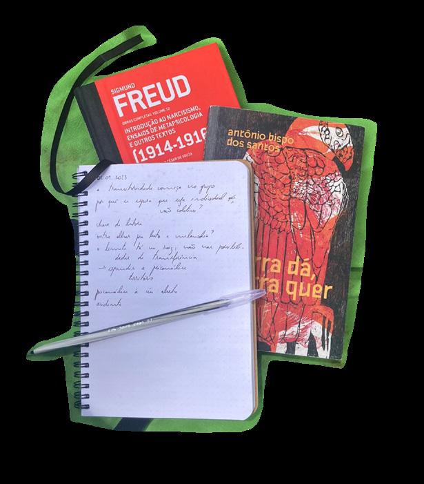 território em si, portador de memória, história e saber. Já no segundo semestre, estamos em busca discutir os pilares teóricos da psicanálise, conceitos importantes para reflexão da clínica que estamos construindo. Assim, não se trata apenas de discutir temas que nos são caros porque somos um coletivo de corpos dissidentes como, por exemplo, gênero e raça, mas de pensar autores, autoras e temas já consagrados pela psicanálise branca europeia, por uma perspectiva contracolonial, e que é condizente não apenas com os nossos corpos, como também com os corpos que escutamos tanto de pacientes, quanto de pessoas que chegam para a roda de estudos na Praça do Derby.