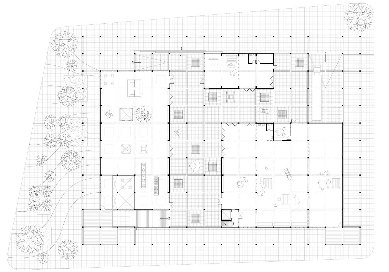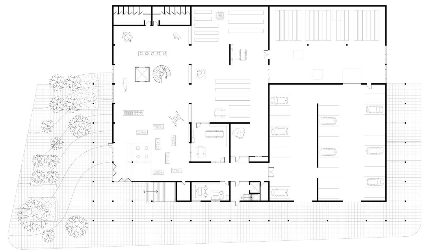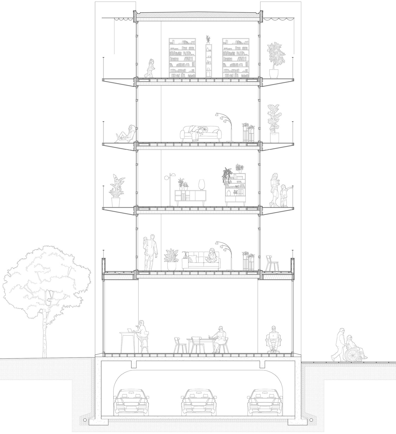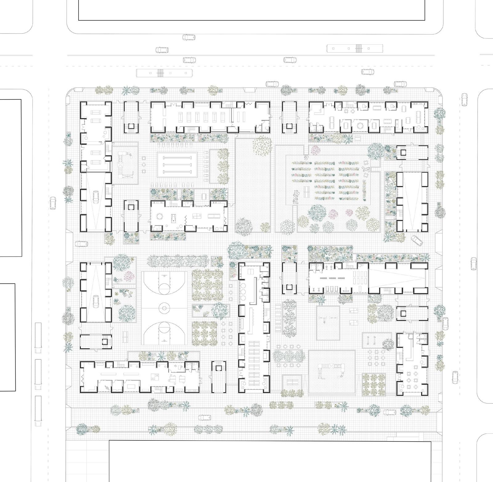 ground floor plan ground floor contains programs such as pharmacy, market, workshare, communal living room, makerspace, biergarten, communal workout room, café, swimming pool, communal garden, basketball court, and playground.