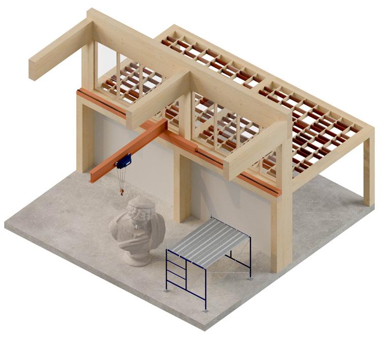 interior rendering of the building center. the building’s structural frame is able to support elements such as a gantry crane, curtains, and other elements that aid spacial organization and construction.