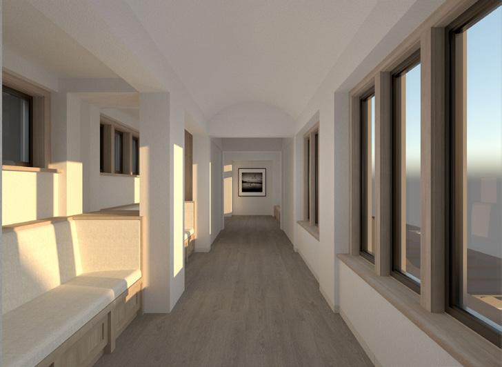 exterior rendering of the southeast corner. the building engages the exterior with large doors, windows, and balcony spaces.