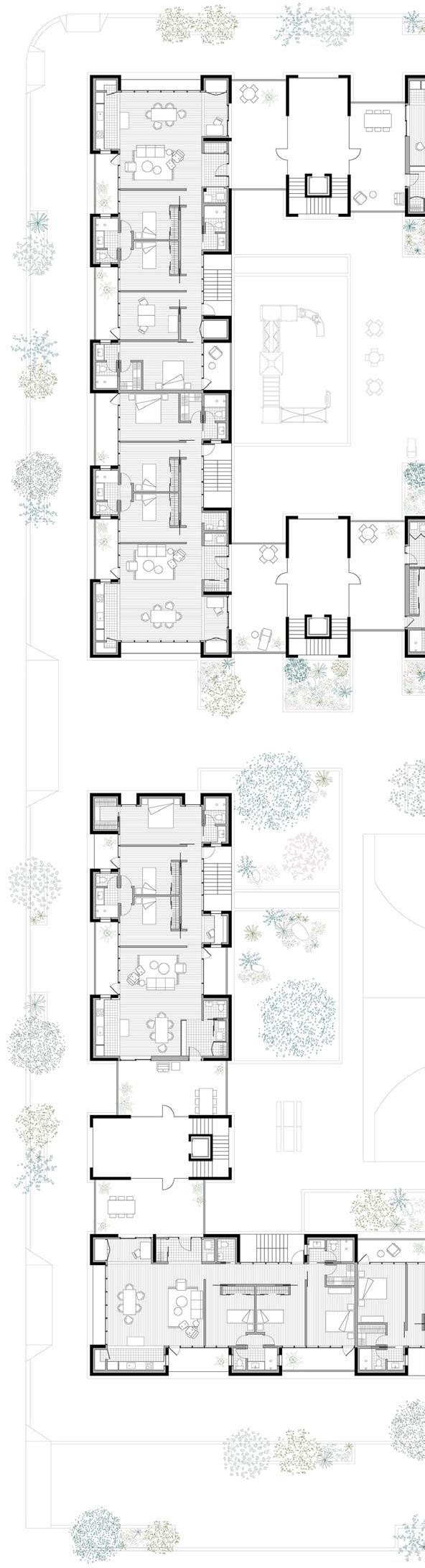 units are accessed through vertical circulation cores. one core serves eight units, two per floor. the circulation strategy is meant to limit the number of units connected to one another—simultaneously maximizing privacy and increasing the chances of neighbors getting to know one another.