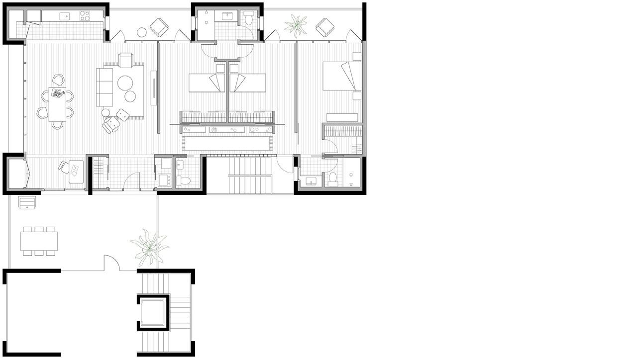 3 bedroom unit. living area and kitchen are adjacent to the entry patio space to activate both interior and exterior gathering areas.