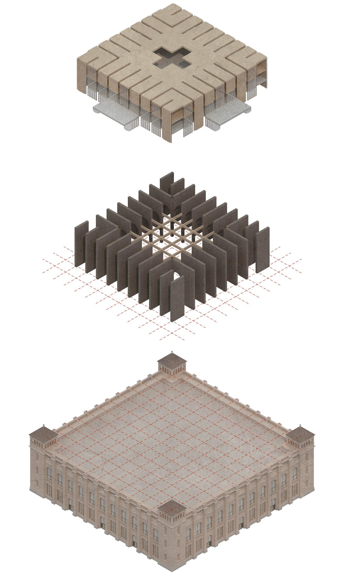 The proposed design is an extension of the existing cistern’s infrastructure. Large, masonry walls extend above the existing 5m x 5m structural grid to support the new, flexible program of the expansion. Programmatically, the addition is split into three parts. Located in the pool of the original cistern, the first level of the addition contains book archive, deposit, and storage space—spaces that require protection from sunlight. The second level contains the “campus living room”, a flexible space capable of acting as an auditorium that primarily serves as a study and gathering space for students. The third level is a mezzanine level, open to the “campus living room”, that contains private offices and open study spaces.