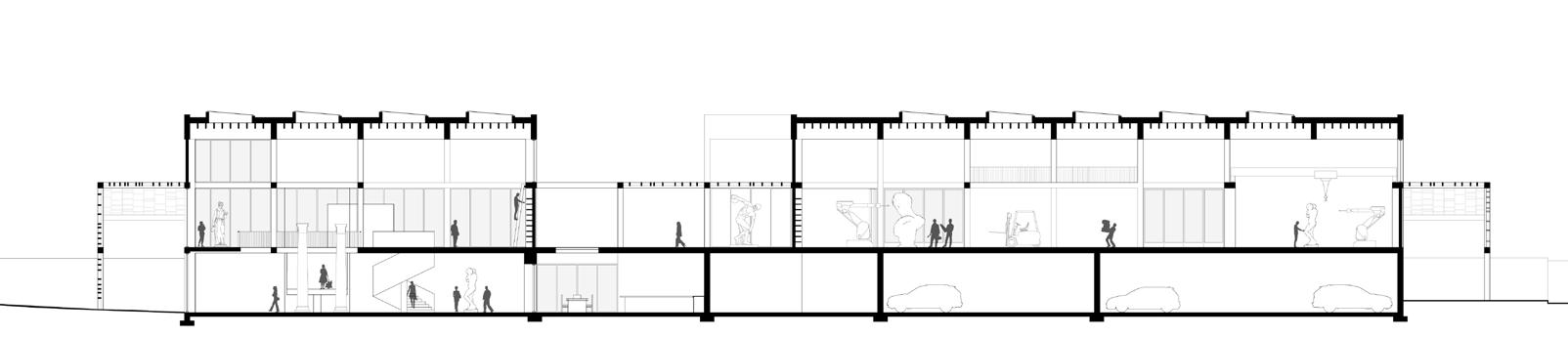 building section looking west (cutting through exhibition, archive, building center, and parking)