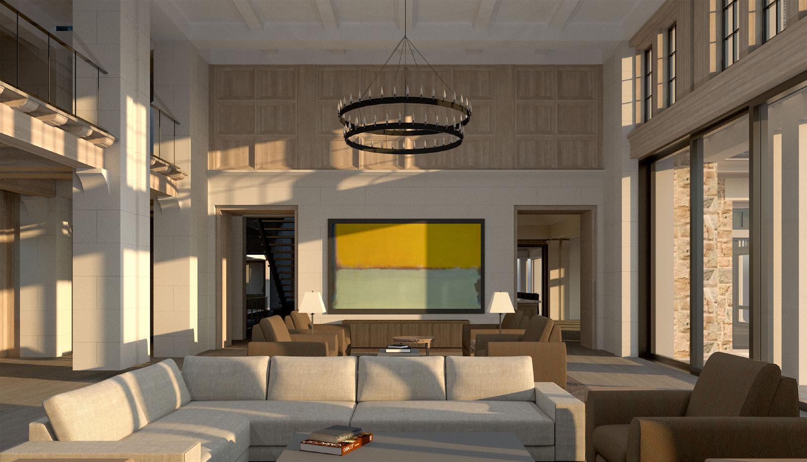 Lake Minnetonka Estate renderings below were used to explore design options and material palettes for a great room and a guest suite link.