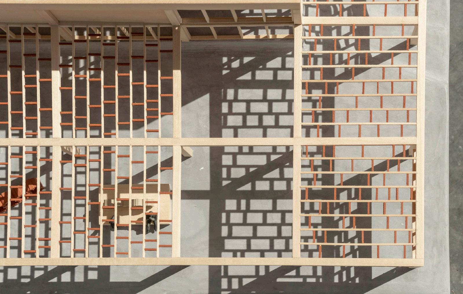 physical model image of the southwest corner. exterior terracotta baguettes create a shadow-scape, which provides shade for interior spaces and exterior paths/plazas.