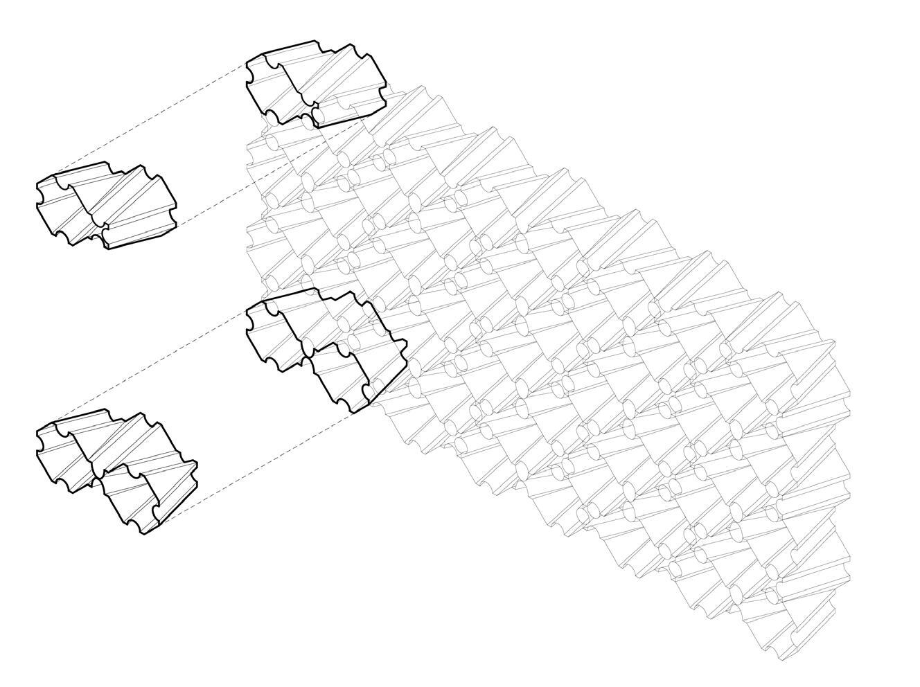 The screen wall prototype, created in partnership with Catherine Hunley, is composed of three geometric units that fit and stack together to create a screen wall. The geometry of the units, inspired by octagonal and square tile patterns, allows for a self supporting wall system. Additionally, texture is added to certain units to display the capabilities of the machine being used—the printer is able to create unique patterns and textures by altering the paths of each printing layer.