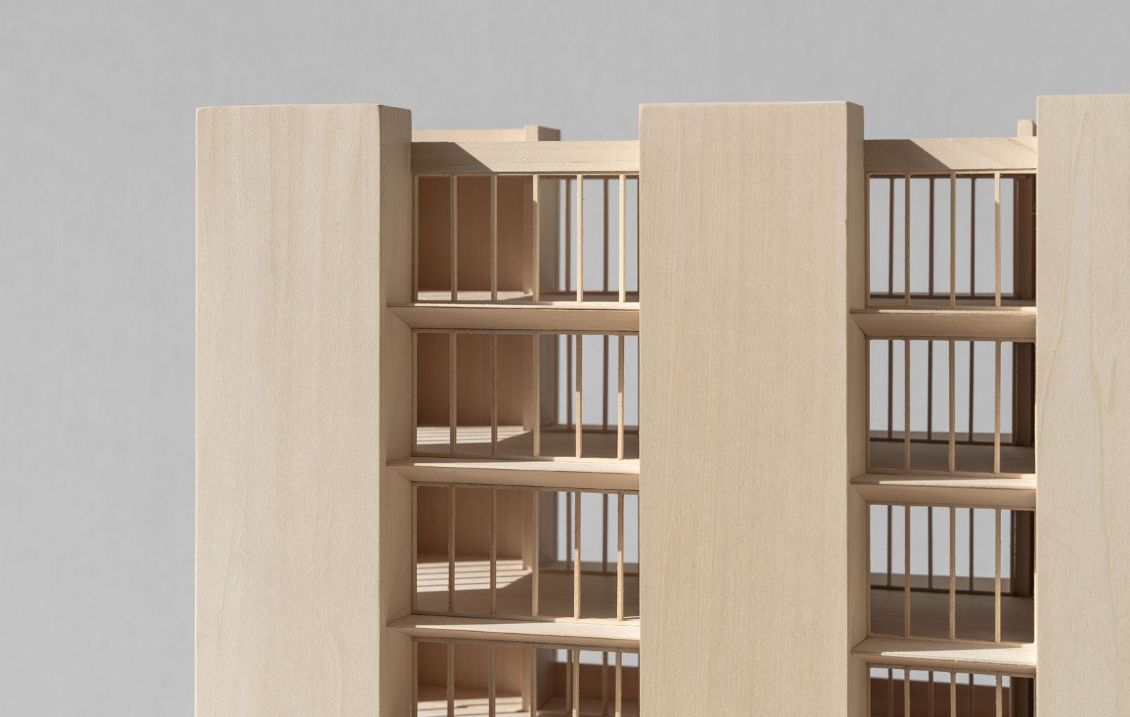 1/4” = 1’-0” physical model built to show structural composition, vertical circulation, and quality of daylight for the end condition of the housing development.