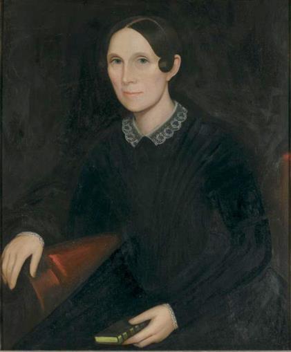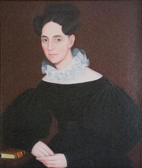 The portraits of this fully-developed period are characterized by somewhat lighter backgrounds of medium brown, boldly stylized black dresses with balloon sleeves, and women with a characteristic leaning posture, usually (but not always) to proper right on a small table, often with books. Curiously, Phillips mostly dispenses with furniture, other than the occasional sofa, and women of this period typically have no visible means of support. Women’s heads are sometimes unadorned, but are more often depicted with elaborate bonnets. The darkness of the women’s black dresses and men’s black jackets and stocks are boldly contrasted with broad white collars and white shirts.