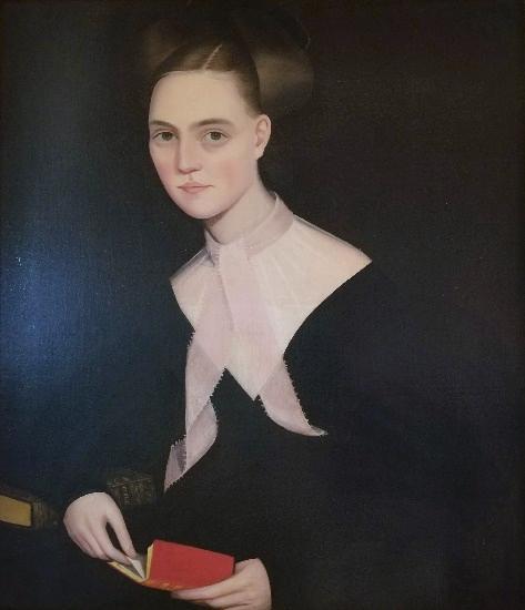 The second element one notices is personalization and uniqueness of detail. No two bonnets are the same. No two pieces of lace have the identical pattern. The variety and intricacy of the fabric detail is mind-boggling. Phillips obviously took great pleasure in incorporating small details which spoke to the subject’s individuality. A held letter may indicate the subject’s name and place of residence. A publication may indicate the date, locality, and perhaps the subject’s religious affiliation or political sympathies. A ledger book, a volume of legal statutes, a large bible, a pamphlet on agriculture, a treatise on anatomy or botany, each quietly announced the subject’s profession or avocation. Books, often newly-published, spoke to the subject’s intellectual currency. For women, the message is quieter but still present. A bound poem, a monogrammed psalm book, a piece of sewing in progress, a religious guide for the afflicted, each spoke to the subject’s literacy, piety, domestic occupation or personal circumstance. The precise symbolism of various natural items such as peaches, parsley sprigs or strawberry buds may be partially lost to us, but the intent is evident. Sometimes the puns are writ large, as with the portrait of young Andrew Jackson Ten Broeck under an “Old Hickory” tree.