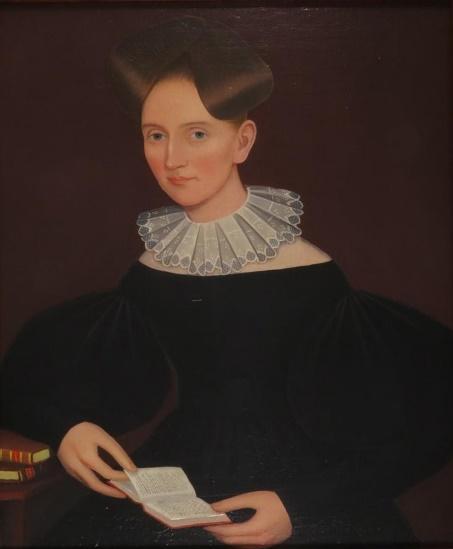 No abrupt change marks the boundary of Phillips’s “Kent Limner” or “Kent” period, which Mary C. Black more broadly defines as 1829-1838. Indeed the Amenia Portraits begin to show that exuberant style. Women’s bonnets often show a triangular shape, as though Phillips was struggling to fit them within the canvas. Women may also be depicted instead with a large ruffled collar or large trim to their neckline, their unadorned head showing off their fashionable “Apollo’s Knot” hairstyle. The effect is the same, with the bonnet or collar providing a stark contrast with the dark background and clothing, and highlighting the subject’s face. Gentlemen’s fashions include