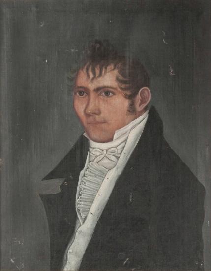 The earliest evidence of Phillips’s emerging classical style is the bust-like depiction of N.B. (Napoleon Bonaparte) Buell dated 1818. Both the portraits of Rev. Gabriel Gebhard and Anna Maria Magdalene Carver Gebhard of Claverack, Columbia County, New York are inscribed with the subjects’ names, “1820” and “Painted by A. Phillips” and “Delineavit A. Phillips”, respectively. Two portraits signed and dated 1821 are Dr. John McClellan and Jonathan Lane, both of Livingston, Columbia County, New York, the latter inscribed “by Mr. Ammi Phillips of Troy.” The portrait of George Selby holding a letter addressed to him in Albany, New York may in fact have been painted at the time of his marriage in May 1821, possibly at Schodack, Rensselaer County, New York.