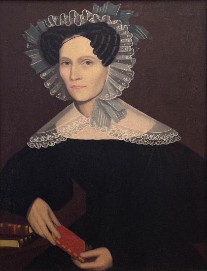 The Amenia portraits, although from a relatively brief period, are a large and cohesive grouping, and many of the subjects are from Amenia, Dutchess County, New York or nearby villages in northern Dutchess County. This seems to represent a peak period of productivity, when Phillips had a steady clientele in one small area. A characteristic element is a distinctively painted pillow-back chair which might have belonged to Phillips. A number of portraits also show Hitchcock-style chairs with gold stencils in various leaf patterns. There is evidence that Phillips may have used some of the commercially available decorative stencils directly on the canvas. In some, the subject appears to be gesturing toward the stenciling. Elaborate tall bonnets become the norm for female subjects of this period, each unique. A pose with long untied ribbons hanging one in front and one in back is also characteristic of the period. Several portraits are specifically dated to 1829 or 1830 from newspapers or letters in the subjects’ hands.
