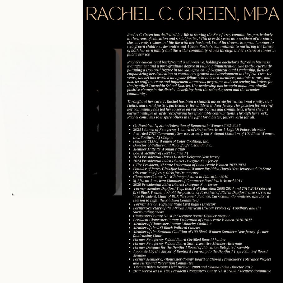 Gina is significantly impacting Bancroft, a respected non-profit organization in New Jersey. In addition, she exemplifies leadership as the Immediate Past President of the National Coalition of 100 Black Women, Southern New Jersey Chapter, and as the 2nd Vice President of Finance and Fund Development. Her contributions extend to serving as an Executive Board Member of the NAACP in Gloucester County and actively participating in the Economic Development Commission, Rent Control Board, and the Mayor’s Committee on Addiction Awareness for Monroe Township, Gloucester County. As Treasurer for the General Federation of Women’s Clubs, an influential international organization, Gina is committed to community enhancement through dedicated volunteer service.