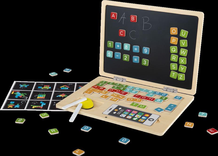 Dečija drvena igračka - laptop ili magnetni sat 78 magnetnih slova, brojeva i aritmetičkih simbola Uklj. sunđer i 2 krede Za otkrivanje i vežbanje godišnjih doba, meseci i dana u nedelji 12 magneta za mesece i lako podesivi drveni klizači za dane u nedelji # 460481