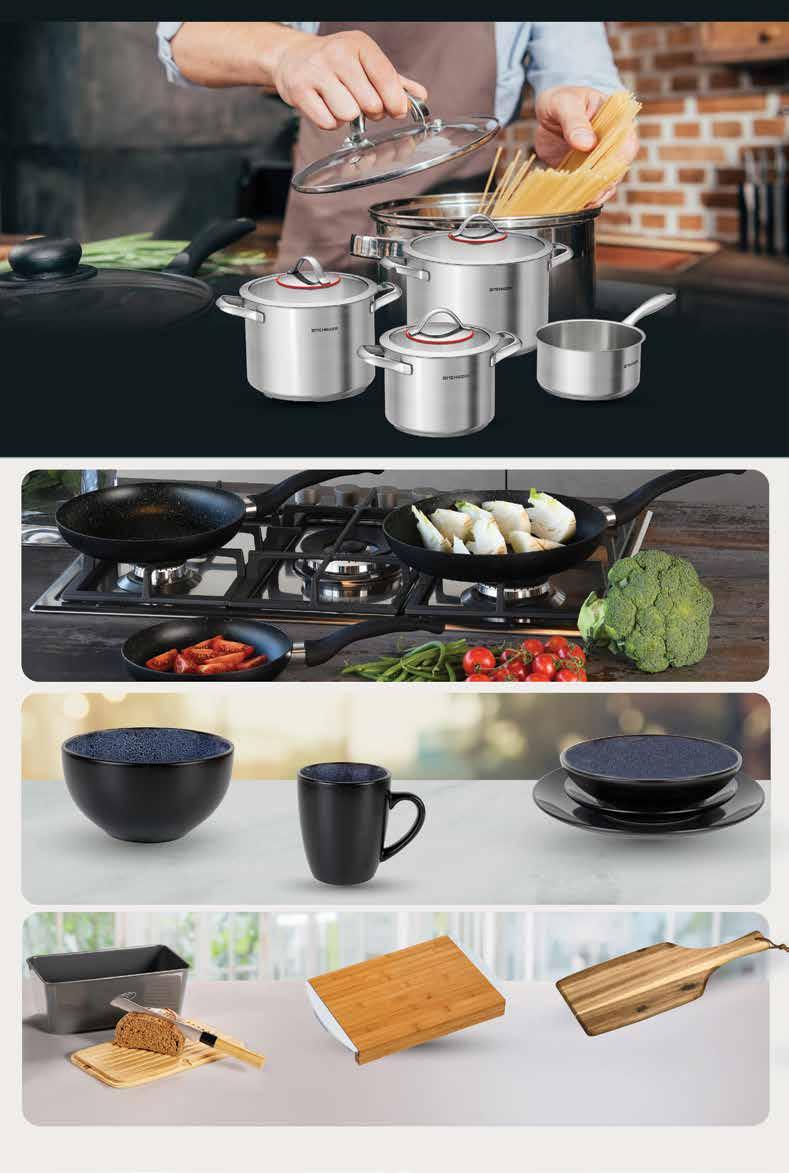 • set se sastoji od posuda za kuhanje i staklenih poklopaca dimenzija 16, 20 i 24 cm i posude za umake od 16 cm bez poklopca