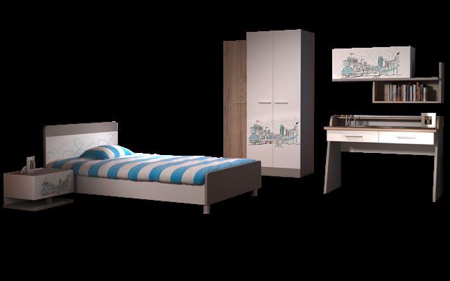 8: Soba za mlade Trend, boja: san remo/bela/siva. Ormar: 120x200x58 cm, krevet: 120x200 cm i noćni ormarić: 55x30x42 cm, radni sto: 120x90x60 cm, viseći element: 120x64x30 cm. Letvice i dušek uz doplatu (05860091/01) 9: Krevet Ivi, drvo bora, boja: bela, dim. 90x200 cm,