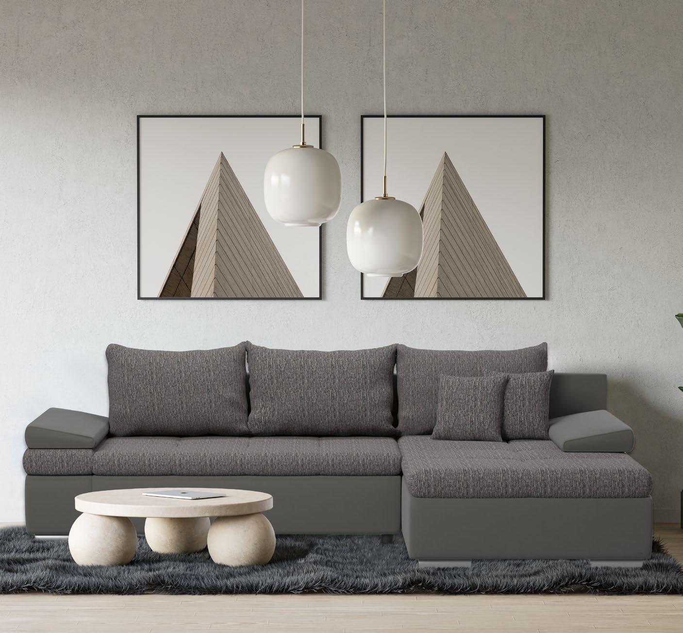 garnitura Milano, levi ili desni ugao, boja: svetlosiva, kombinacija štofa i eko-kože, na razvlačenje, dim. 274x182 cm. Boks za posteljinu