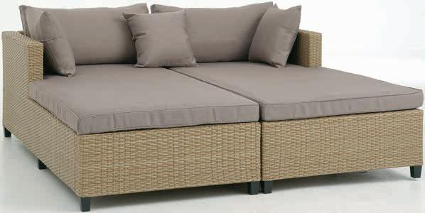 Stol: Aluminij i umjetno drvo. Š60xD105xV41 cm. Dvosjed i stolice: Aluminij i tekstilen. S luskuznim jastucima s dugotrajnom, grubo trajnom navlakom. 999 €