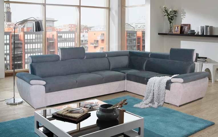 Sjedeća garnitura Emili, lijevi ili desni kut, boja: svijetlo siva, dim.: 345x191 cm, podesivi nasloni za glavu uključeni u cijenu. Uz nadoplatu dostupan velik broj elemenata za sastavljanje vama idealne garniture kao: podesiva dubina sjedišta, podesivi naslon za ruke, izvlačna klupa pomoću elektromotora, daljinski upravljač te jastuci različitih dimenzija. (02450372/01,03)