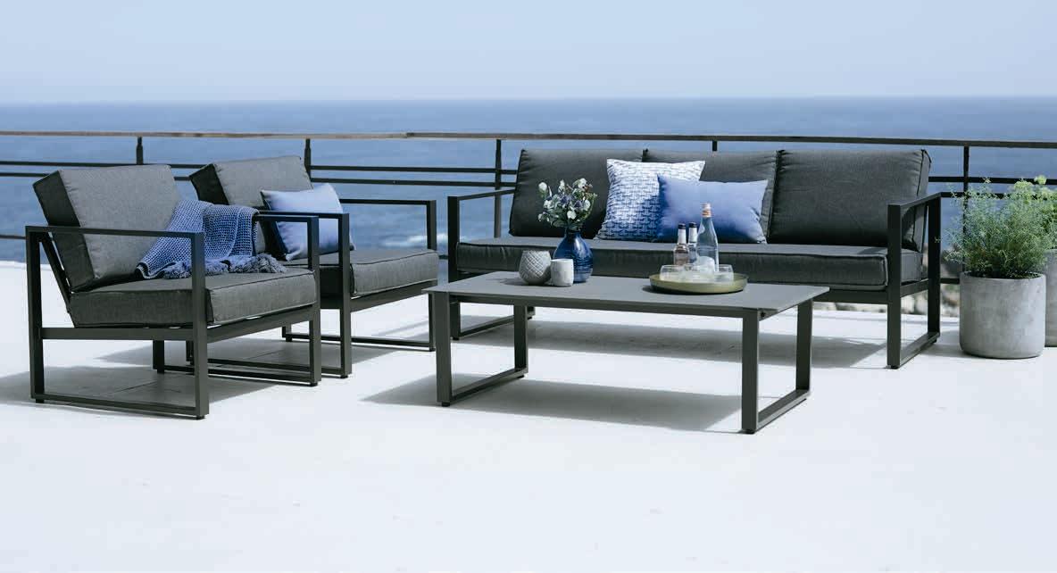 Stol: Aluminij i vlaknasti cement. Š64xD129xV40 cm. Trosjed i stolice: Aluminij. S luksuznim jastucima s grubo tkanom navlakom koja se brzo suši.* 1499 €