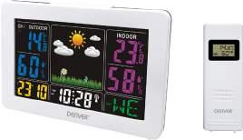 Vremenska stanica Denver WS-540 s radio kontroliranim satom (s DCF), ekran u boji, unutarnja i vanjska temperatura i vlaga, uključuje 1 vanjsku sondu (do 3 podržane), ikone za prikaz indeksa udobnosti, vrijeme, datum i funkcija alarma, 12/24 sata, izbor C / F, faza mjeseca 1 kom