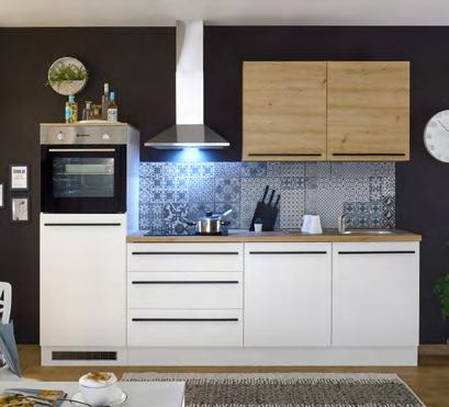Kuhinjski blok Noah, boja: bela/ artisan hrast, širina 260 cm, visina 220 cm. Cena je za drveni deo, električni aparati i oprema uz doplatu. Sastav: viseći kuhinjski element sa nagibnim vratima x2; donji kuhinjski element x 2, kuhinjski element za sudoperu, kuhinjski element za ugradni fržider, radna ploča visine 38 mm; ručke uključene u cenu (12790139/01)