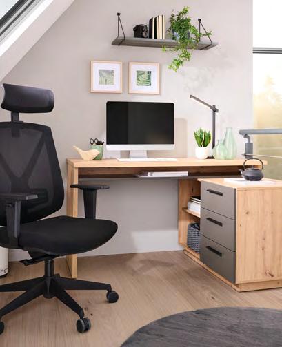 Radni sto Ghia, boja: artisan hrast/siva, 3 fioke, 2 pregrade, leva ili desna montaža, dim. 138x75x105 cm. Kancelarijska stolica Rhyan, boja: crna,, podešavanje po visini, okretno (07780059/01; 07880003/01)