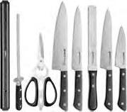 Set noževa Harakiri 8/1, visokokvalitetni nerđajući čelik. Set se sastoji od 5 profesionalnih noževa - nož šefa kuhinje 20,8 cm, nož za tranžiranje 19,6 cm, višenamenski nož 10 cm, nož za hleb 18 cm, univerzalni nož 15 cm, kuhinjskih makaza, oštraača i zidnog magneta (44870024/02; 37240050/01)
