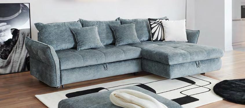 Ugaona garnitura Polo, levi ili desni ugao, boja žalfije, dim. 275x180 cm, ležaj dim. 153x232 cm, sanduk za posteljinu, 3 leđna i 2 mala jastuka uključeni u cenu. Uz doplatu dostupan tabure i ukrasni jastučići (23000113/01-02)