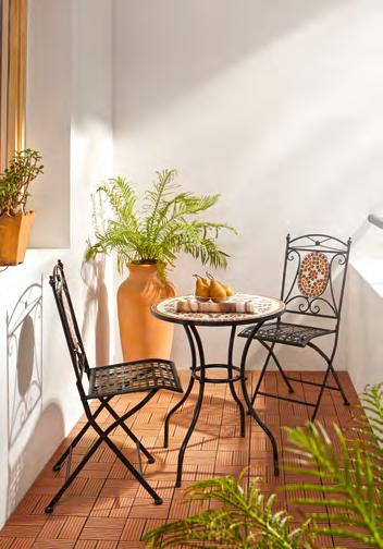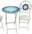 Balkonski set Wien i Belvedere sastoji se od dve sklopive baštenske stolice dim. 36x91x35 cm i stola od kovanog gvožđa u crnoj / beloj boji s keramičkim mozaikom dim. 72x60 cm (05380002/09; 05380009/09)