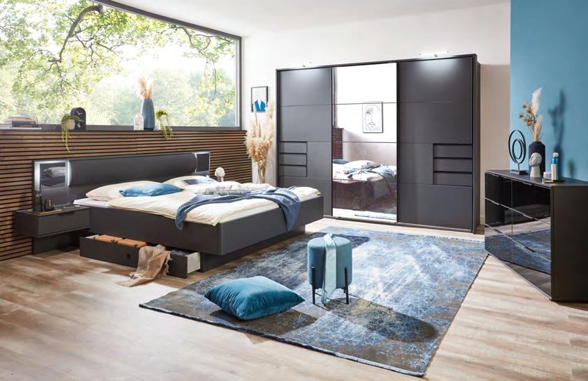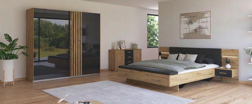 Spavaća soba Mosbach, boja: artisan hrast/antracit siva. Ram kreveta sa 2 noćna stočića, dim. 279 x 93 x 245 cm, dim. ležaja 180 x 200 cm, rasveta uključena u cenu, letvice i dušek uz doplatu. Ormar sa kliznim vratima , bazalt staklo, dim. 271x210x62 cm, 3 šipke za odeću, 3 police. Paspartu uz doplatu. Komoda , 2 vrata, 4 fioke,