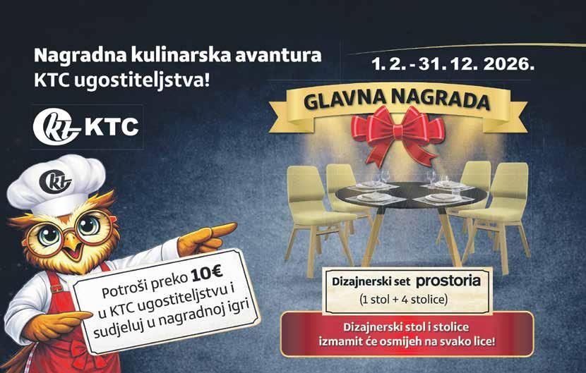 Za sudjelovanje na poleđini kopije računa ispišite svoje ime, prezime, adresu i broj telefona te ispunjenu kopiju računa ubacite u za to predviđenu kutiju. U nagradnoj igri nemaju pravo sudjelovanja zaposlenici KTC-a te članovi njihovih obitelji. Izvlačenja: 1. krug: 12. 3. 2026., 2. krug: 16. 4. 2026. i 3. krug: 14. 5. 2026. Fotografije su simbolične naravi i ne moraju u potpunosti odgovarati stvarnom izgledu proizvoda.