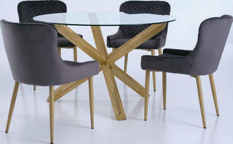 Sto: masivna hrastovina i kaljeno staklo. Ø119xV75 cm. Stolice: baršun i čelik. Sto 36999,- 20000,- Stolica 14999,- 7500,AGERBY sto