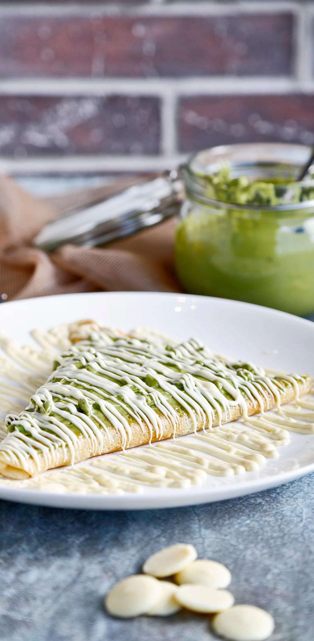 Ubaciti belu čokoladu i krem od pistaća po ukusu, sve lepo sjediniti. Preliti preko palačinki u vatrostalnoj činiji, posuti mrvljene pistaće odozgo za dekoraciju i peći na 180 stepeni oko 10 minuta.