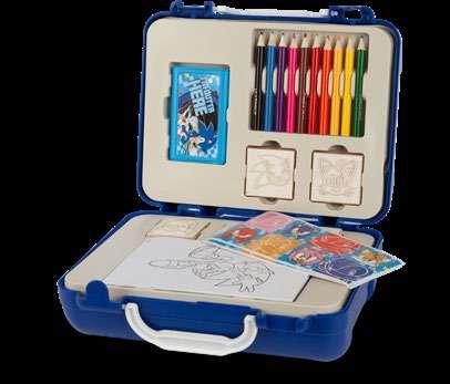 Sklopivi kovčeg s dvostrukom ručkom koji sadrži: 5 drvenih i pečata od prirodne gume, plavu perivu tintu, 10 olovaka u boji, 1 album s 24 ispisane stranice i 64 naljepnice za personalizaciju kovčega.