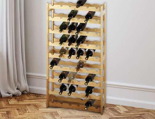 Od borovine, za 54 boce, dimenzije: 62 x 25 x 120 h cm, max nosivosti 100 kg.