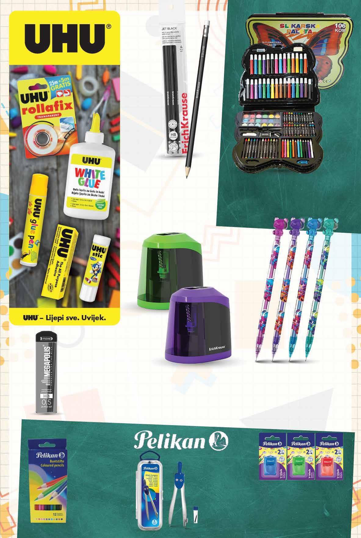 • pernica sadrži: 18 bojica, 2 olovke, gumicu, šiljilo, ravnalo, škare i ljepilo u stiku