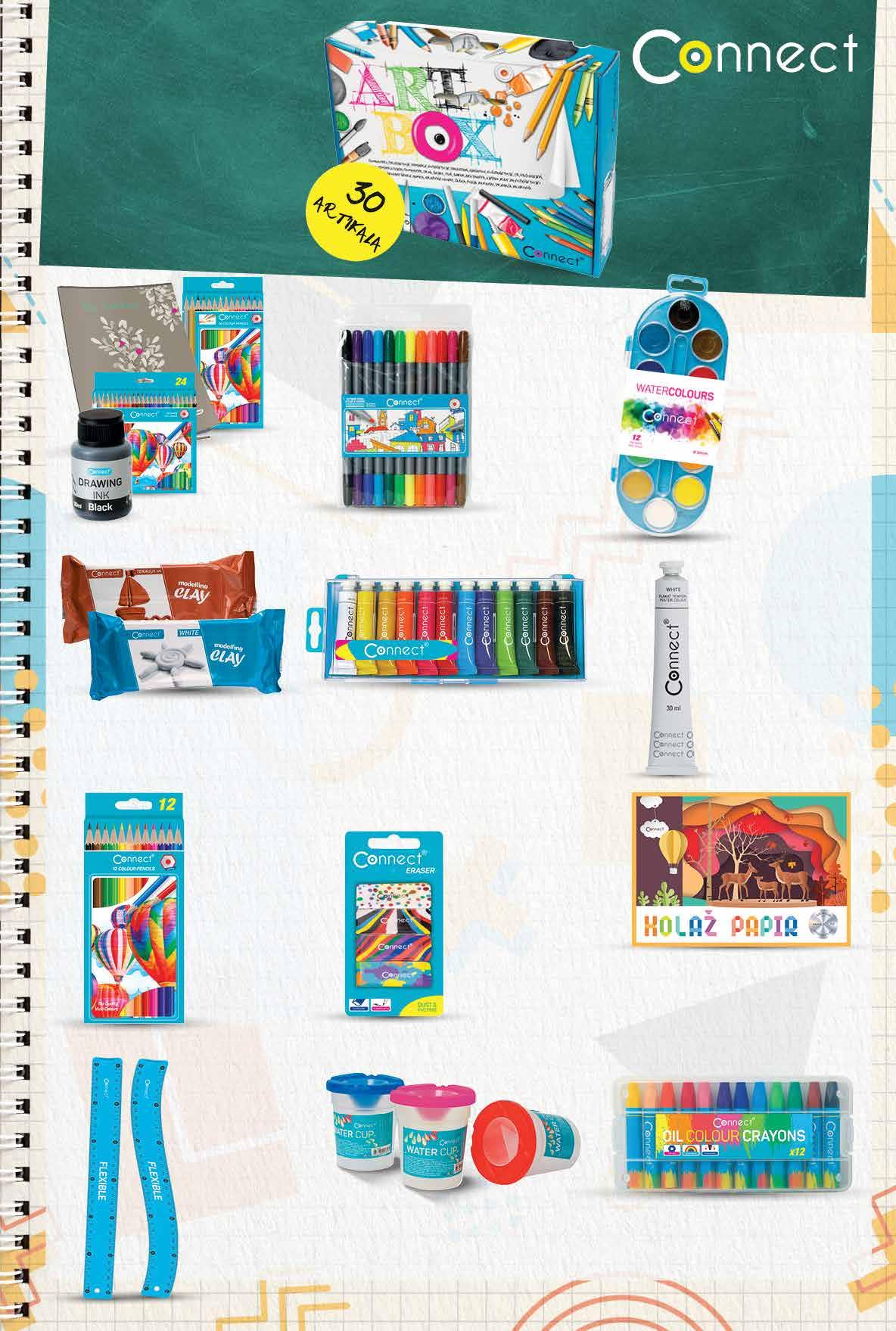 • set sadrži: 8 markera u boji, 8 voštanih bojica, 8 bojica, 10 vodenih boja, kist za boju, paleta, ravnalo, gumicu, šiljilo, HB olovku, spužvu za brisanje, 2 stranice s naljepnicama