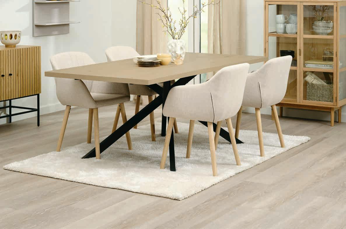NORTOFT sto + ADSLEV stolice Sto: ukrasni furnir i čelik. Š95xD200xV75 cm. Stolice: tkanina i masivno drvo. Sto 34999,-