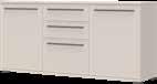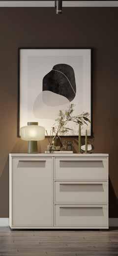 Komoda je u beloj mat boji i po prvi put u ponudi, unutrašnjost u drvodekoru Furneo hrast. Zlatne ručice, visoke nožice i diskretne obline čine je elegantnom, dok soft-close mehanizam omogućava tiho zatvaranje fioka i vrata. Kombinacija forme i funkcije podiže celokupan enterijer na viši nivo. Komoda sa tri fioke i dva krila pruža lakoću u svakodnevnom odlaganju.