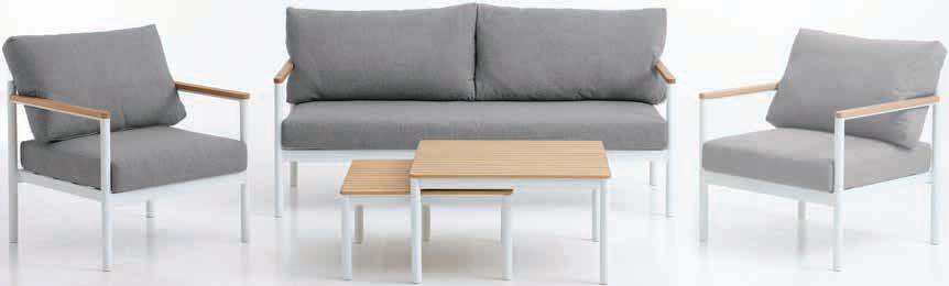 Stol: Aluminij i nauljeno FSC® tvrdo drvo. Š72/62xD72/62xV39/32 cm. Trosjed i stolice: Aluminijum i nauljeno FSC® tvrdo drvo. S