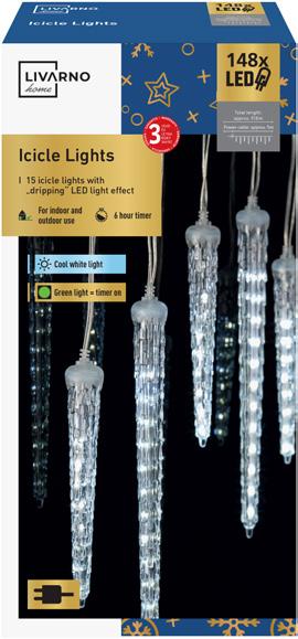 15 dekorativnih ledenica sa LED efektom treperenja prema dole 148 dugotrajnih LED sijalica toplo ili hladno belog svetla koje štede energiju Ukupna dužina: cca 17,6 m Kabl za napajanje: cca 5 m # 484802