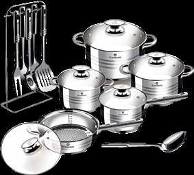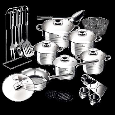 27kom/set, set uključuje: lonce s poklopcem 24×14,5cm (6,1l), 20×12,5cm (3,6l), 18×11,5cm (2,6l), 16×9,5cm (1,9l), posudu za umak s poklopcem 16×9,5cm (1,9l), tavu za prženje s poklopcem 24×6,5cm (2,9l), 7 dijelni set kuhinjskog pribora s postoljem (kuhača, gnječilica, žlica s rupicama, kutlača za juhu, kutlača za špagete, žičana metlica), 3 dijelna posuda za začine s magnetskom podlogom, 2 bakelitne podloge, košaru za prženje s odvojivom ručkom