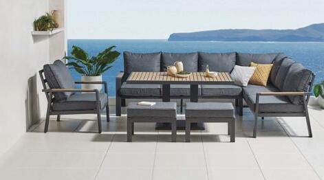 5.599 € Set CARACAS, 5 komada, podizni stol 90x150cm, visina do 75cm, kutna garnitura s jastucima 221x288cm, fotelja s jastucima 81x95cm, 2x tabure s jastukom 60x40cm, aluminij, antracit ili bež