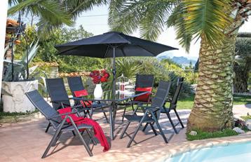 599 € 879 € Vrtni set DELUXE, 8 komada stol 90x150cm, metal/staklo, 6x podesiva stolica (7 razina) i suncobran promjera 2,5m 239