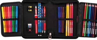SADRŽAJ: 12 FLOMASTERA, 12 DRVENIH BOJA, 2 HB OLOVKE, HEMIJSKA CRVENE I PLAVE BOJE, NALIV PERO, GUMICA I REZAČ