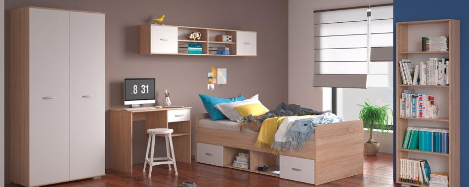 Soba za mlade Luna HDF, boja: Sonoma hrast / bela. Ormar dim. 123,4 x 218 x 56 cm. Krevet, dim. 120 x 200 cm. Letvice i dušek dostupni uz doplatu. Radni sto, dim. 110 x 71 x 60 cm. Viseći regal, dim. 125 x 35 x 38 cm (05860042/06)