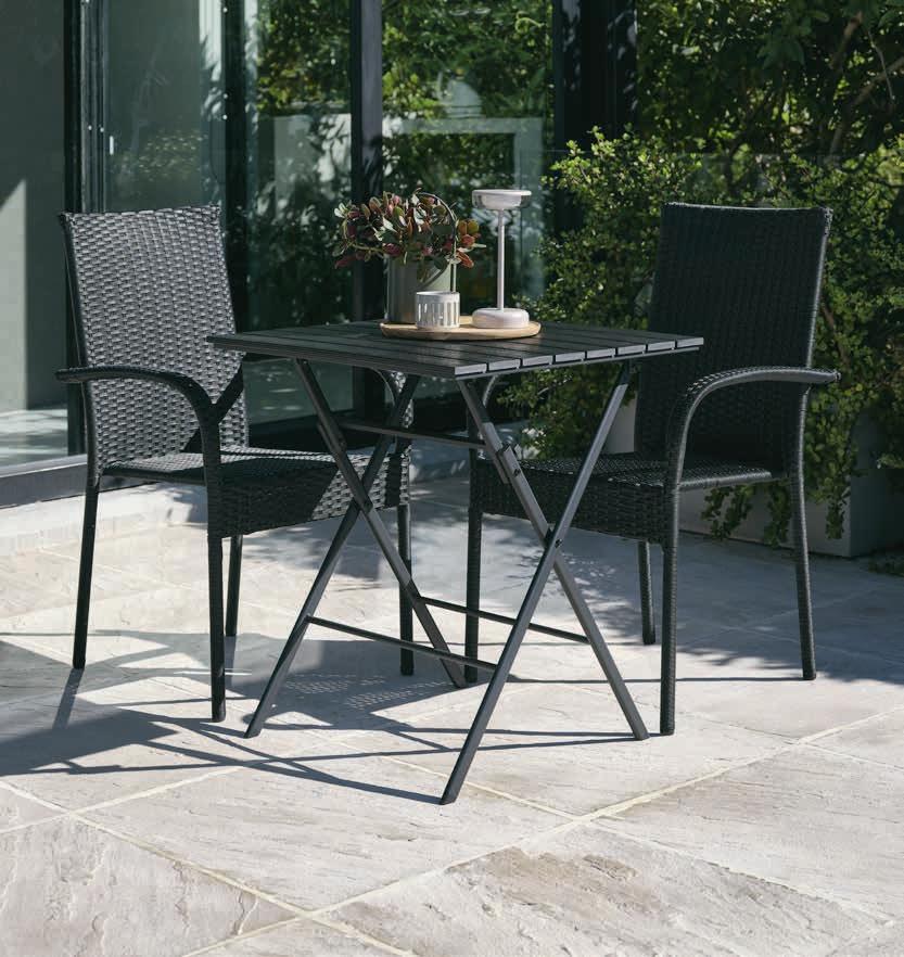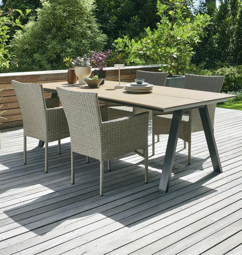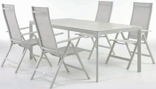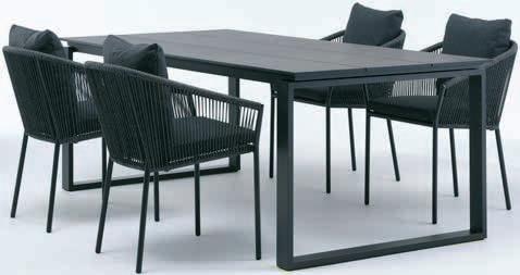 Stol: Aluminij i nauljeno FSC® tvrdo drvo. Š72/62xD72/62xV39/32 cm. Produženi dvosjed i stolice: Aluminij i nauljeno FSC® tvrdo drvo. S luksuznim jastucima s dugotrajanom grubo tkanom navlakom od olefina. Olefinska tkanina ima postojanu boju i ne upija vlagu. 1599 €